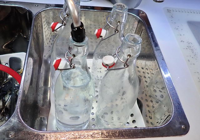 To be sure your drinking water is as good as it can be, install your watermaker with a valve to switch between putting water in your tanks or into the sink. After filling the tanks for the day, switch to the sink outlet and fill glass 1 litre bottles – only drink water from the glass water bottles, not from the tanks. We have 8 one liter bottles. My wife and I normally drink a total of 4 liters per day. Two of the glass bottles are kept cold in the refrigerator, 6 are in a canvas holder, and one liter is readily available in a glass thermos on the dinette or, at sea, in the galley sink.