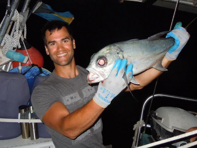 “During our peacefully calm night crossing from Vieques to Culebra we were trolling two fishing lines behind the boat, in the hopes of catching ourselves a yummy, free, meal.. As dawn broke we felt the line vibrate and the next hour was spent reeling in the catch as we bobbed along our course. When it got to the boat we were surprised at its smallish size considering the fight it gave, and couldn’t quite identify the type of fish it was. It looked like the shape of a small mahi with the colors of a tuna. Once we arrived in Vieques and were all settled in, Eben went online and spent about an hour trying to identify this mystery fish, but no luck.