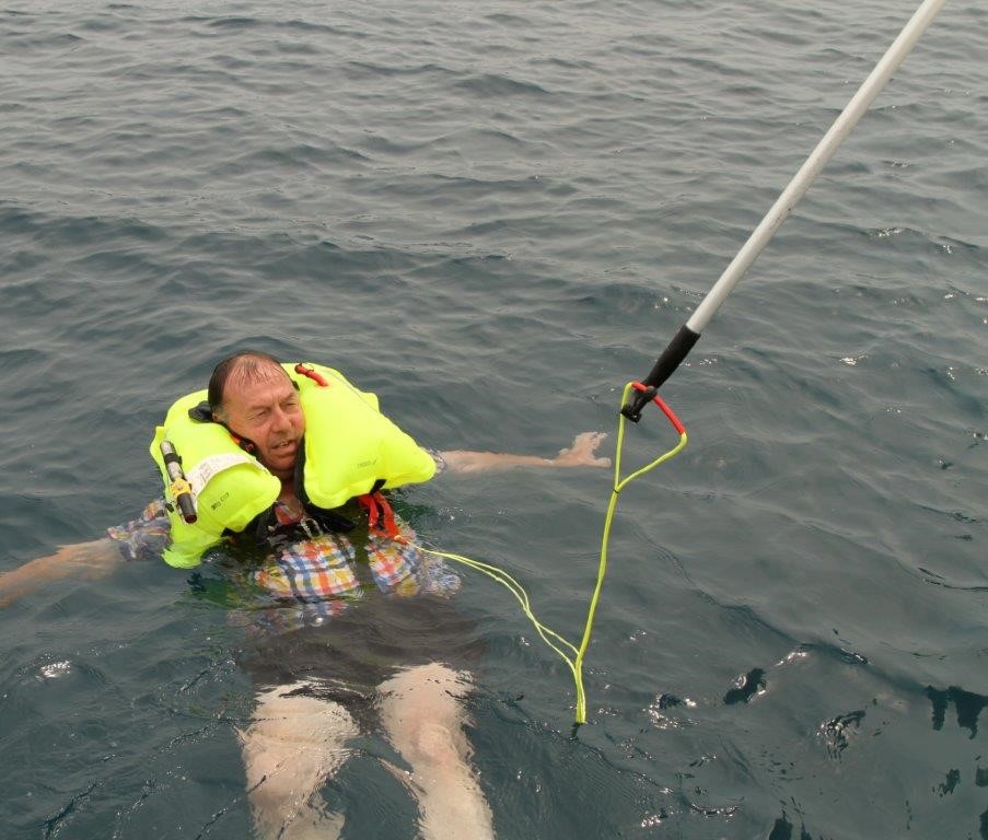 The point though is that if a man in the water in a lifejacket does not have a MOB Lifesaver fitted to his lifejacket and he cannot attach the line that we are handing down to him, then this makes things very difficult. We simply cannot reach down to him from the average 35 foot boat to attach it for him.