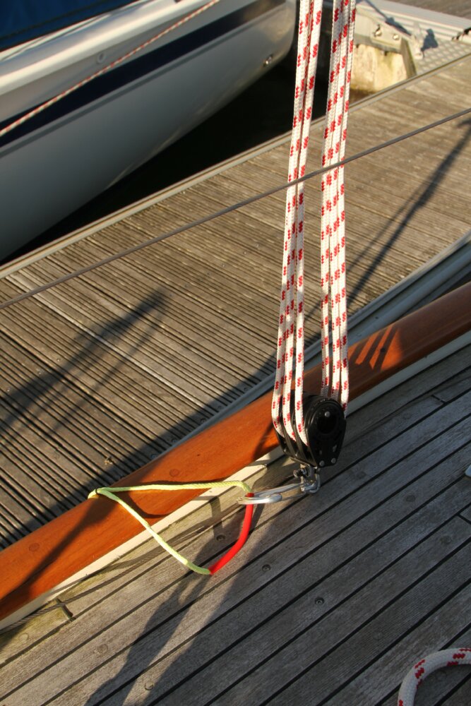 This for me is a 6-part ratcheted block tackle from Harken suspended on the spinnaker halyard.