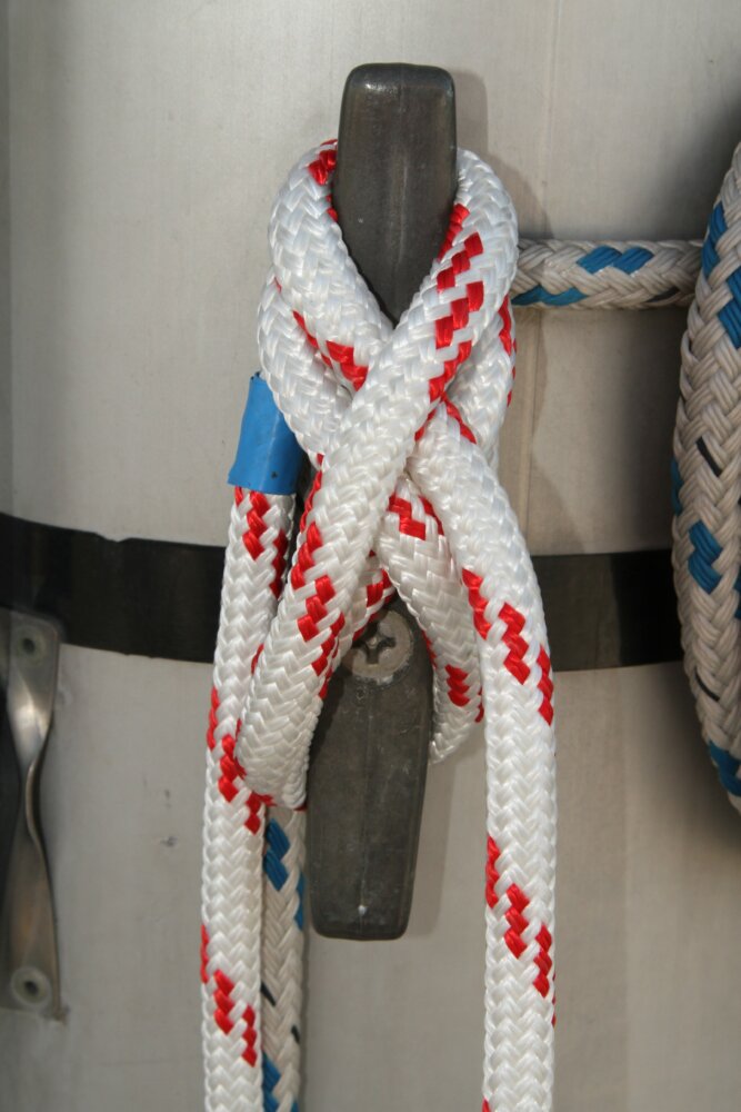 A piece of blue tape on the spinnaker halyard tells me when I have raised the tackle high enough. I then tie it off with a figure of eight and a locking hitch.
