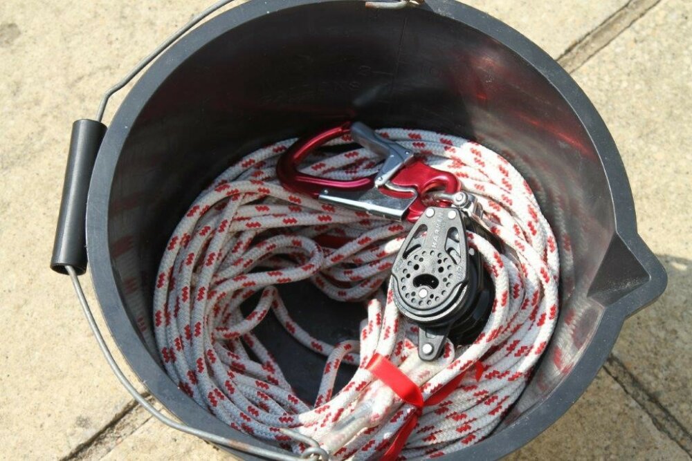 I keep the tackle extended and coiled in a bucket ready, so there is no delay in setting it up. To prevent it from twisting I tie a silk by each block, once round and then a bow, which is easy to undo with cold fingers.