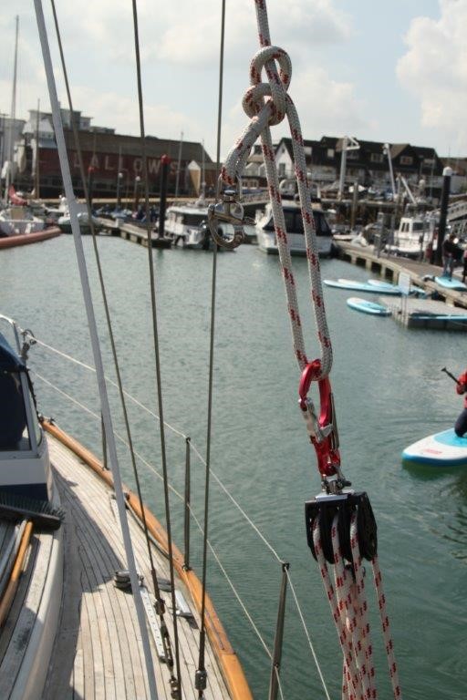 I don’t trust the snap shackle on the end of the spinnaker halyard so I will tie a bowline in this and then clip the Kong carabiner on the top block to this.