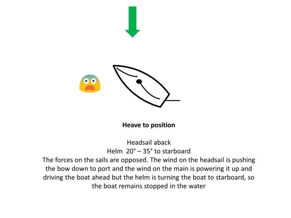 We will of course have had to get our boat to become stopped in the water without any creeping forward or fore-reaching as it is called, so practicing heaving-to and getting ‘0’ knots of boat speed is very important.