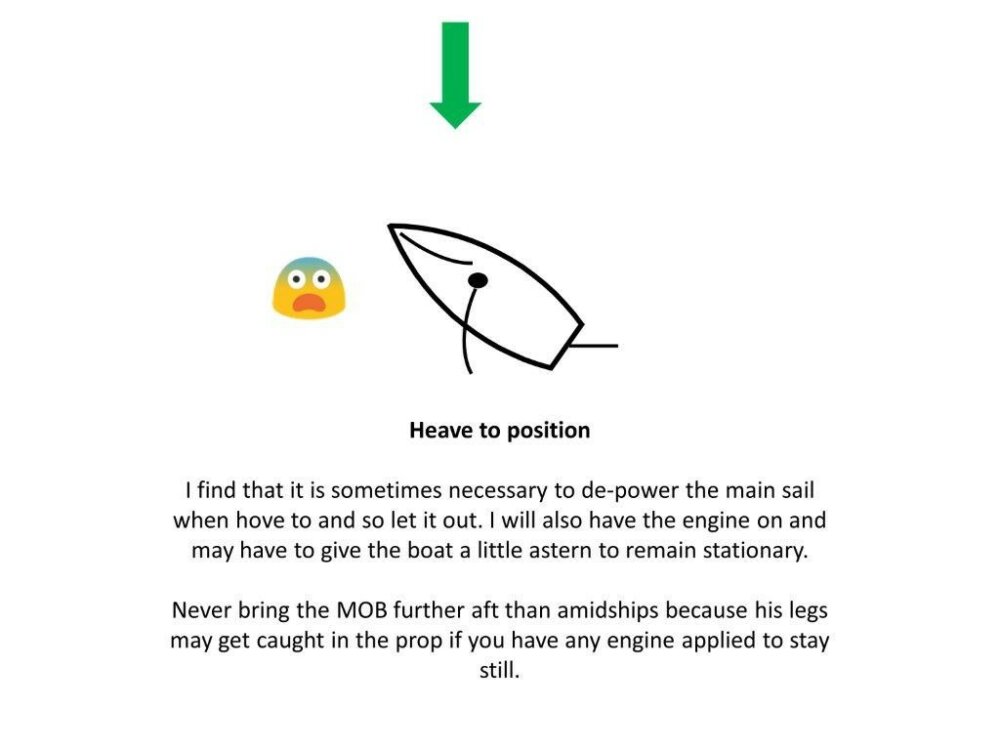 When I am close to the casualty – and remember if I have the engine on, regardless of whether or not it is in gear, I will make sure that the casualty never comes further down the boat than amidships, because of the danger to propellers turning or stopped and dangly legs- I will let out the main further, this helps to de-power it and stops us from running past the casualty.