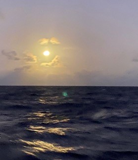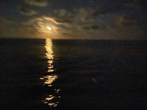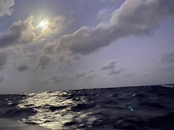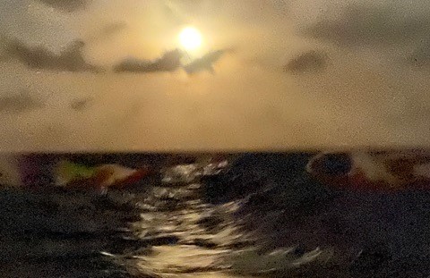 Tonight, when I came up for my watch at 2 AM, I found us sailing almost to the moon as it lay straight in front of us. The same feeling as sailing to the end of a rainbow, as if there is something at the end. Come, come this way – they are pulling us closer and closer to a big secret or treasure.