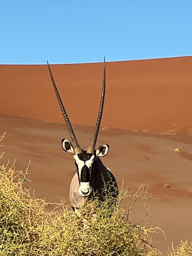 We went to Sossusvlei, which is approximately five hours drive on a rough road from Walvis Bay. This is the most popular park in Namibia and one could quickly see why. Red sand dunes the size of small mountains towered over a flat, dry river valley. Vistas – the likes of which we had never seen – were everywhere and we would recommend other cruisers take the time to visit. It’s best to get accommodation for a night or two in the area, as it is too far to do in one day.