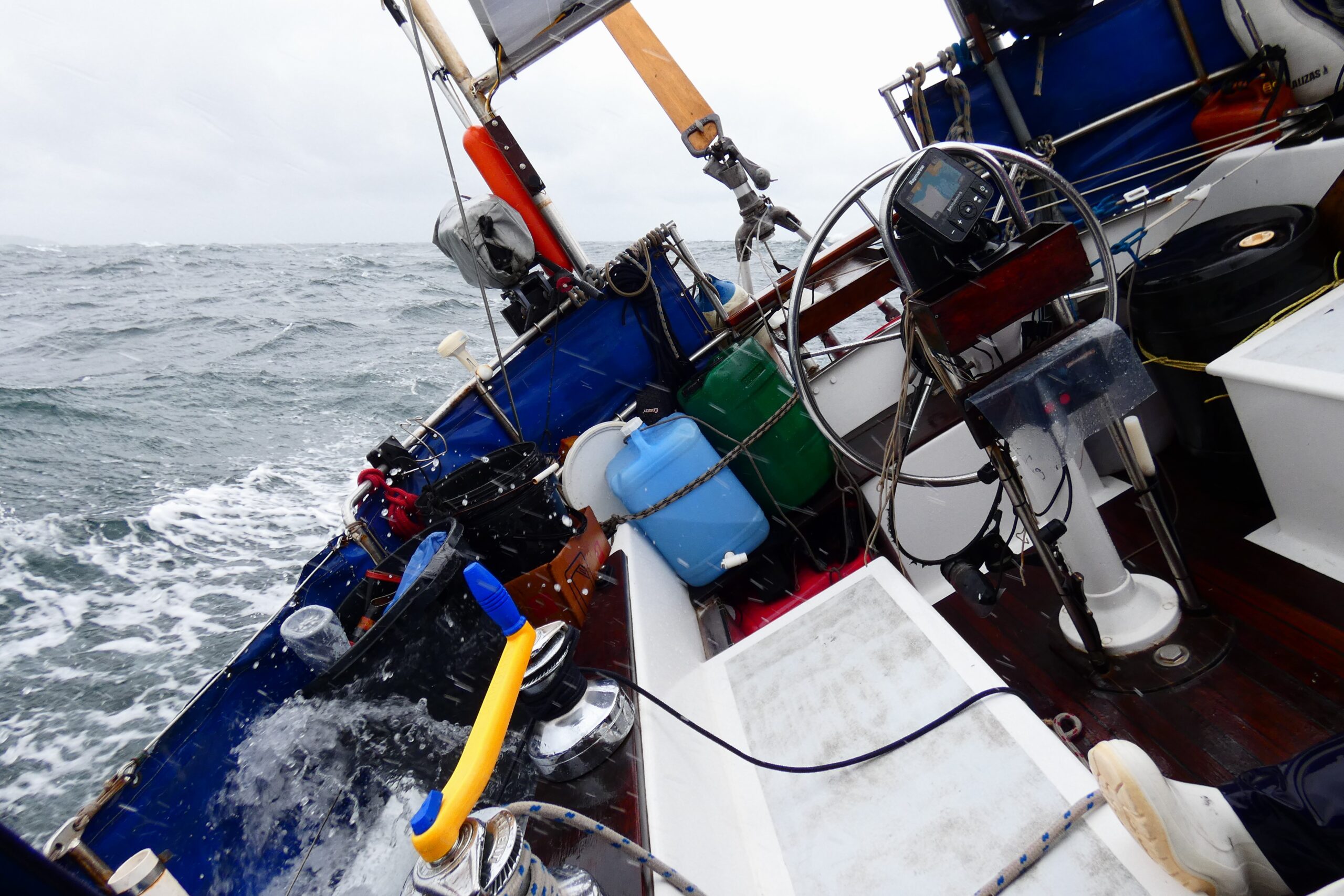 Next day a cold front blew up from the south then south-west as we navigated the 50 nm back to Puerto Toro. The wind went from 20 to 30 knots gusting 40 plus! We were in the shelter of the islands but still felt the force of the winds. Our windvane steered while Martin and Alan took a stint outside in the cockpit with their goggles on, to see through the driving rain. John and I were down below when a larger than normal wave forced its way through the overhead hatch – which was screwed down tight – and poured down over the navigation instruments on the chart table. One of the pot hatches blew open at the same time, and emptied itself across the cabin. We were so glad that we were not out in the Drake Passage sailing around the Horn now!