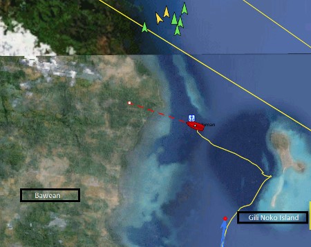 We could not find a suitable and protected anchorage right next to Gili Noko but we found a nice big area closer to the mainland near a public dock (connected to the main round island road). We anchored at Kar Pakiman 05° 47.51′ S – 112° 44.91′ E in 16m good sand, plenty of room to turn 360deg, with calmer seas as the NW to SW wind and swell does not reach here close to the coast. CM93 charts are inaccurate so navigate with caution.