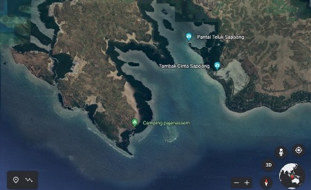 In order to break our passage, we decided to seek shelter from strong winds and seas in the well-protected southern bay at 06° 59.0400′ S – 115° 18.3600′ E in 10m with good sand/mud and well-protected during North monsoon. Watch out for uncovering sand mount at low tide near the entrance to the bay (charted incorrectly on CM93 but seen on Google Earth). It gets really too shallow in the different bays to explore any further and there is nothing of interest. There are infrequent fishermen in small boats attending to their traps and fishing by line. It is a good place to rest and do some repairs, but there is no internet.
