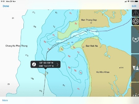 Outside Yacht Haven Marina – much of the anchoring space has been taken over by moorings (Bht 1,000 a week) and several reports of mooring dragging – contact davefourie@gmail.com to make a booking. So if anchoring you have to go north, making sure you do not anchor in the superyacht channel which is clear on Navionics. A long dinghy ride in to shore – 0.6 NM approx. There is a lego pontoon near the Living Room restaurant which you can use for free. If you go into the marina they will charge you Bht 1,100 a week to use the dinghy dock, but you also get use of their palatial showers and loos. Several good eateries outside the marina, otherwise not much here.