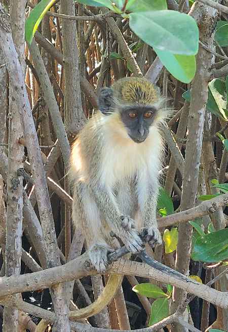 A precarious dinghy dock leads to the lodge, where you can sit for a drink while watching green monkeys scurry about in the trees. A robust walk along sandy streets will take you through a residential area to a commercial district. We supplemented our food supply at the roadside market, where bananas, peppers, cabbage, tomatoes, and dried goods were available. Luckily, watermelon (USD 1.00-2.00 per large melon) was in season, too!