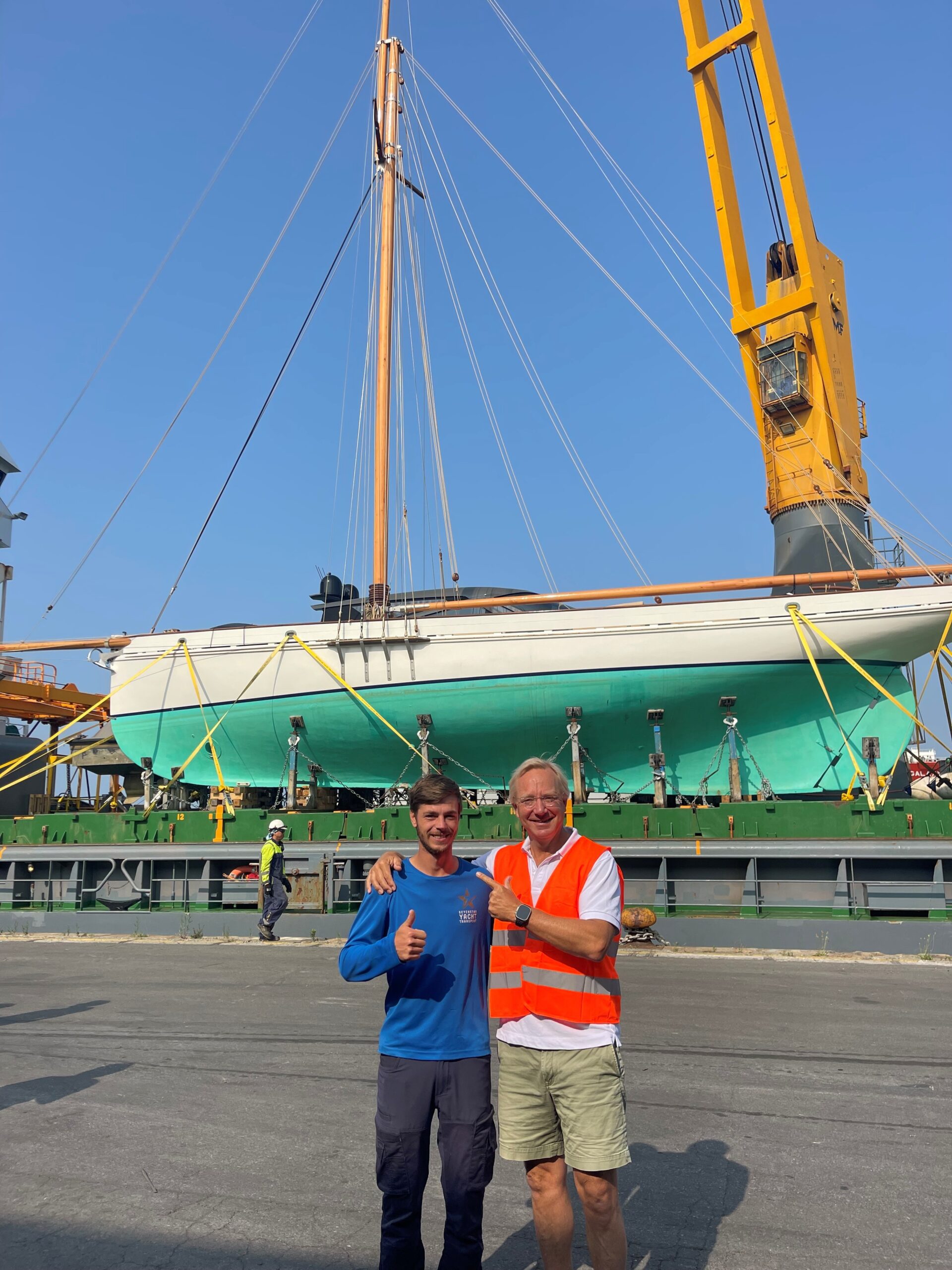 Sevenstar Yacht Transport assembled a team of experts to chart her path. Sean Lines, Bram van der Zee, and Guido Seeleman conducted detailed inspections and worked with loadmasters to custom-design a hoisting plan. Every surface in contact with supports was protected. Her long keel, traditional wooden hull, and converted yawl rig all received special consideration.